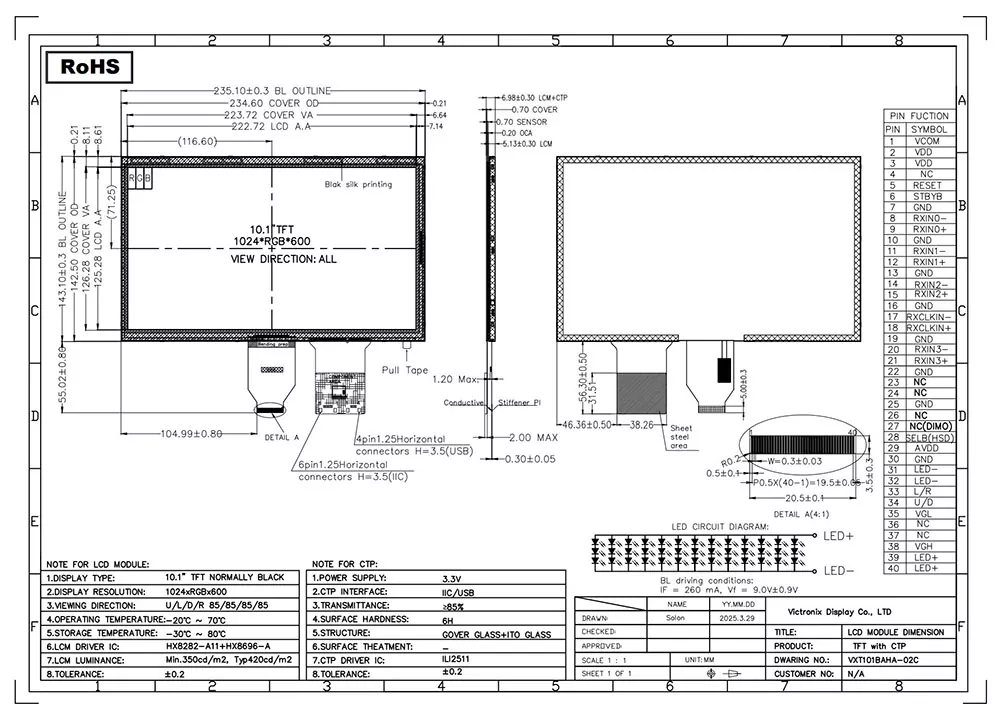 Victronix er en profesjonell produsent og leverandør av TFT -modul med base i Kina. Med 18 års erfaring på dette feltet har vi utviklet en rekke modeller. I tillegg til våre standardprodukter, tilbyr vi også tilpassede tjenester for å imøtekomme våre kunders spesifikke behov. Denne 10,1 tommers 1024 × 600 LVDS TFT-modulen med CTP er en høykvalitets 10,1 tommers TFT-skjermmodul konstruert for industrielle, medisinske og innebygde applikasjoner. Ved å kombinere høy optisk ytelse, kapasitiv berøringsfunksjonalitet og utvidet pålitelighet, gir den eksepsjonell klarhet og holdbarhet under ekstreme driftsforhold.