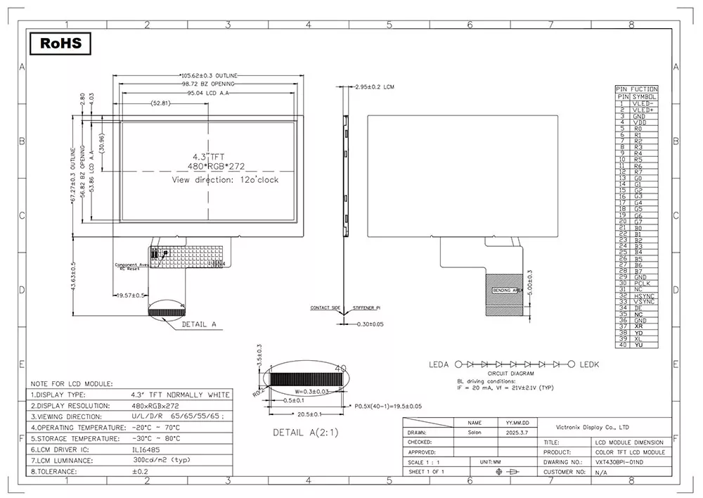 TFT LCD er en type flytende krystalldisplay som bruker tynnfilm-transistorteknologi for å forbedre bildekvaliteten, og den har mange applikasjoner i hverdagen. Som en profesjonell TFT -modulprodusent og leverandør i Kina, hva gjør Victronix 4,3 tommer 480 × 272 industriell TFT -modul forskjellig fra andre produsenter? For det første gir den en typisk lysstyrke på 300cd/m², en bred synsvinkel på 65 ° i 12 -klokken, og et kontrastforhold på 700: 1, og sikrer utmerket lesbarhet fra forskjellige vinkler. For det andre integrerer den en bakgrunnsbelysningsenhet som bruker 7S1P-hvite lysdioder med en typisk levetid på 30 000 til 50 000 timer (til 50% innledende lysstyrke), noe som sikrer klar synlighet under alle lysforhold. Dessuten støtter det et RGB -grensesnitt med ILI6485 -kontrolleren. I tillegg passerer den streng miljøtesting, inkludert termisk sjokk (-30 ° C ↔ +80 ° C-sykluser), luftfuktighet lagring (60 ° C/90% RF) og mekanisk vibrasjon, og sikrer at den kan fungere sømløst over et utvidet temperaturområde (-20 ° C til +70 ° C).